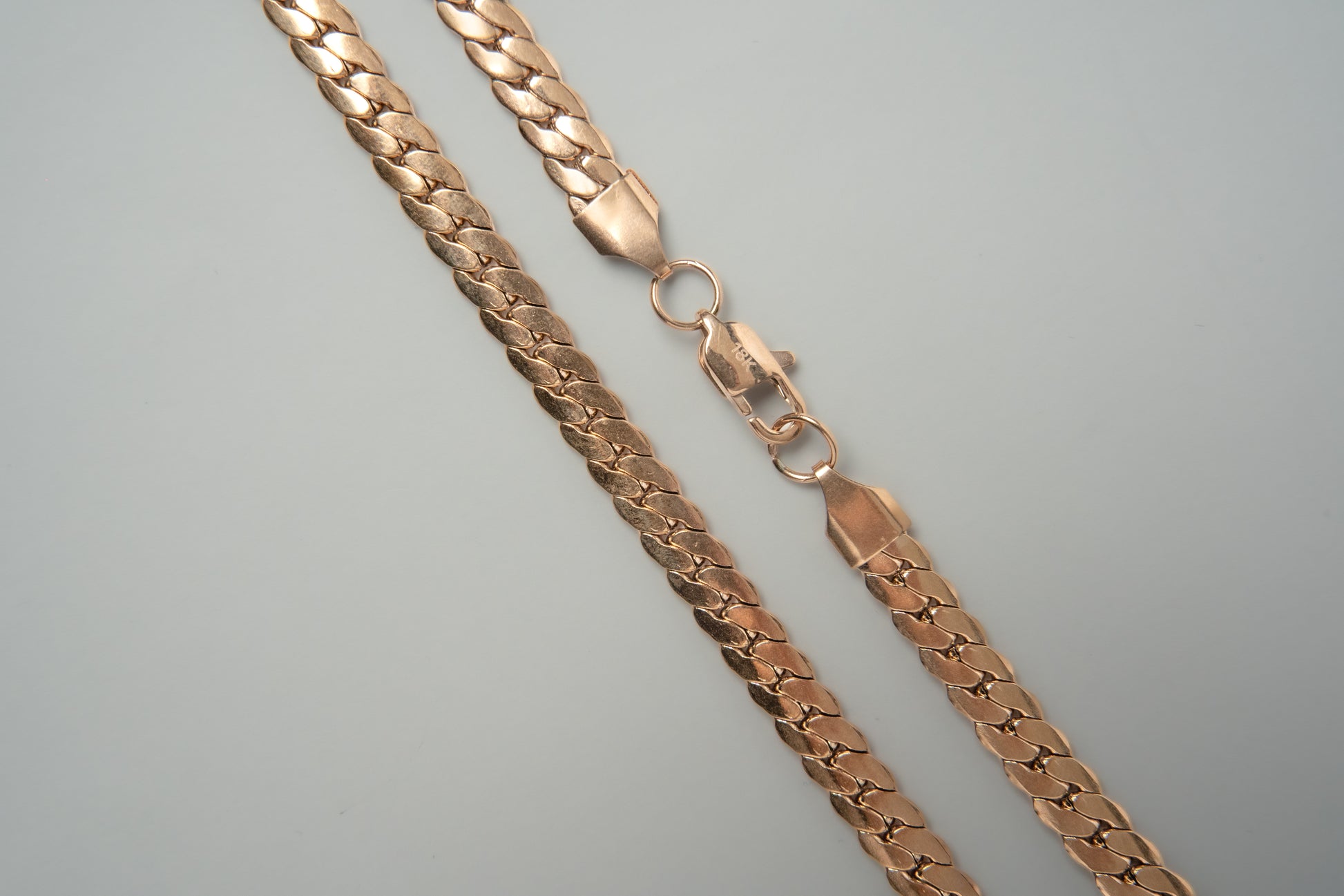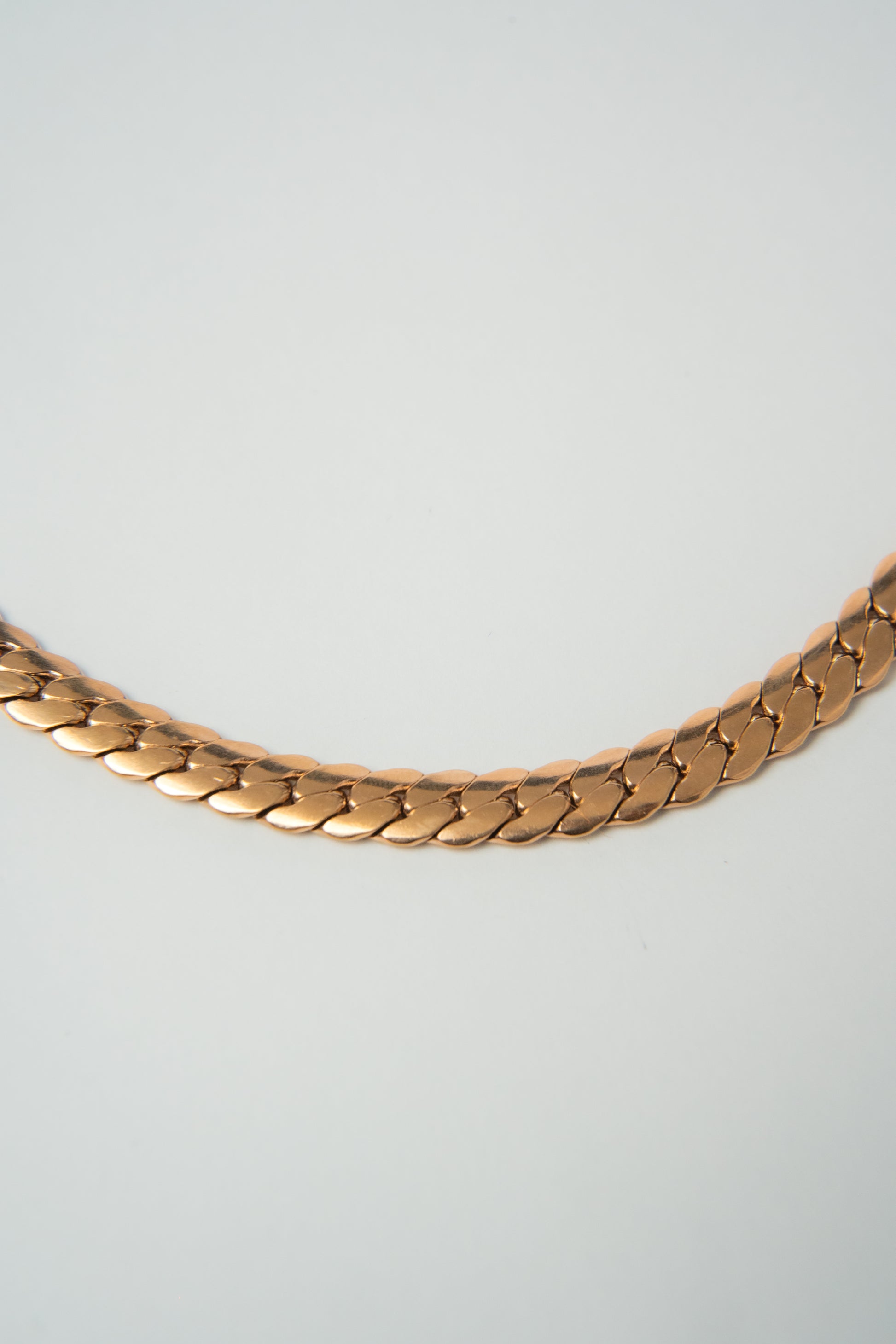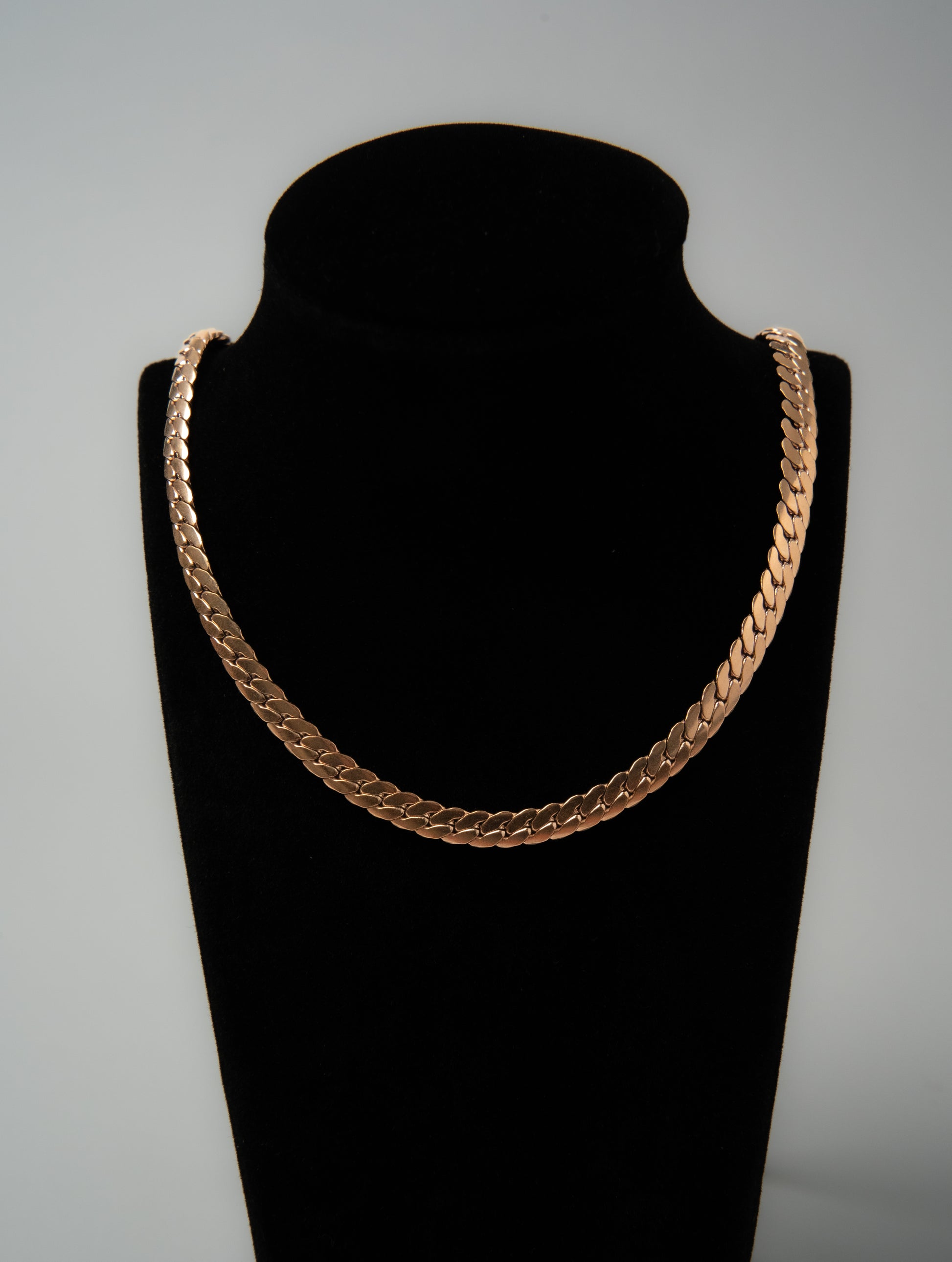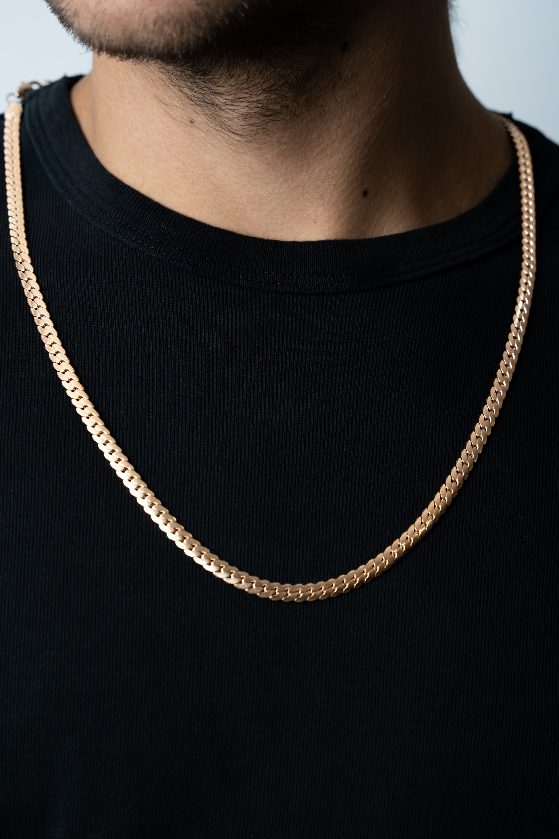 Elegancia y estilo en una sola pieza. La cadena "Serpiente Rosa" es un accesorio sofisticado para el hombre moderno. Con un diseño de eslabones tipo serpiente en tono dorado rosa, esta cadena combina la fuerza y la delicadeza en un look único. Ideal para complementar outfits casuales o elegantes, la "Serpiente Rosa" es una pieza que destaca por su belleza y calidad.