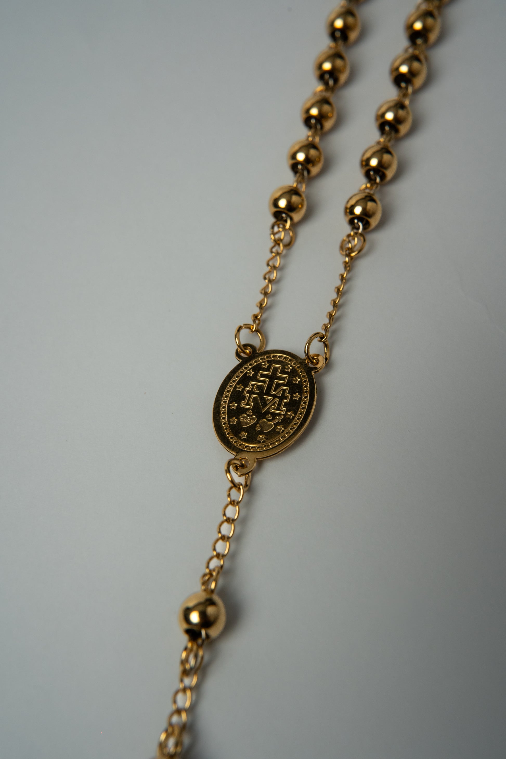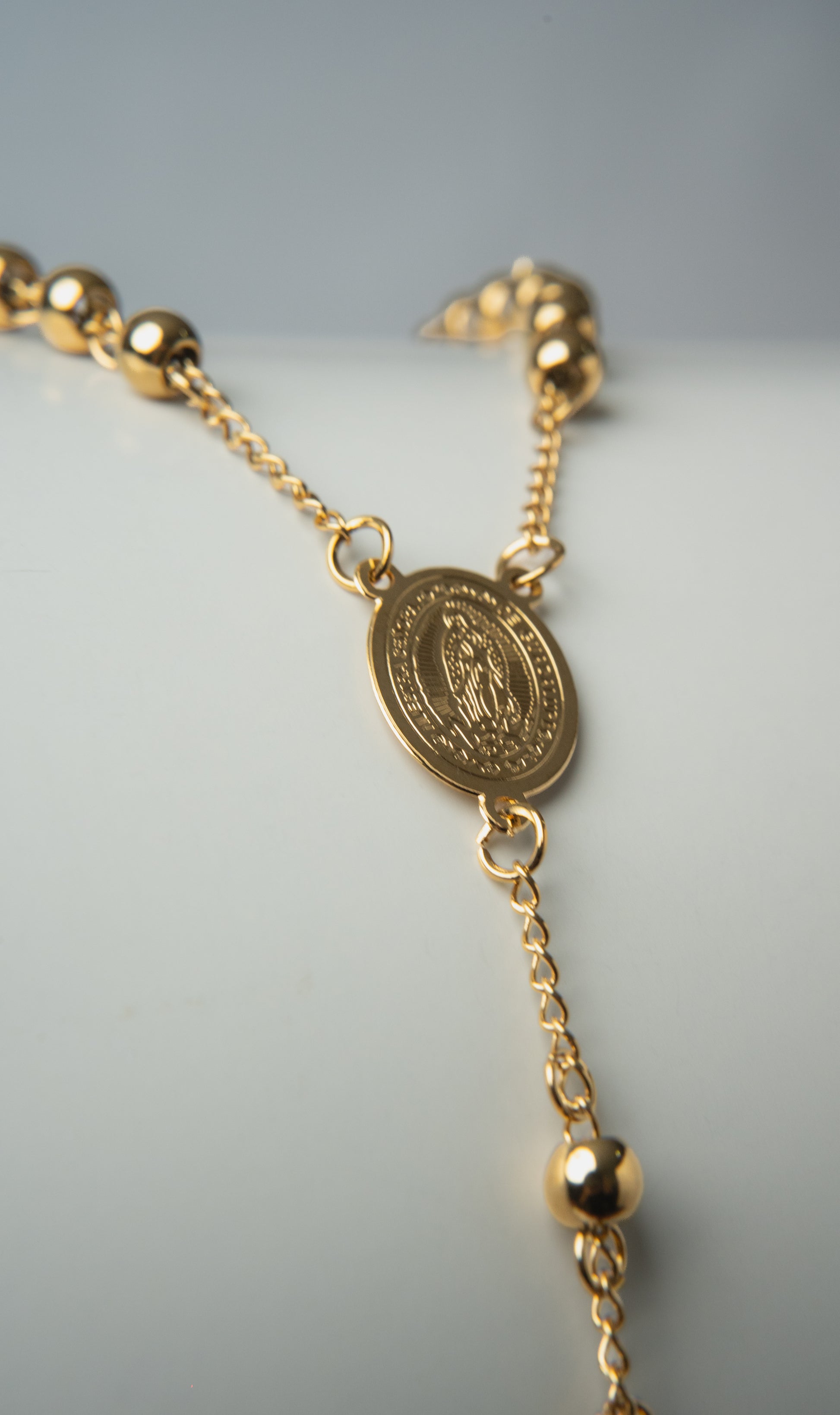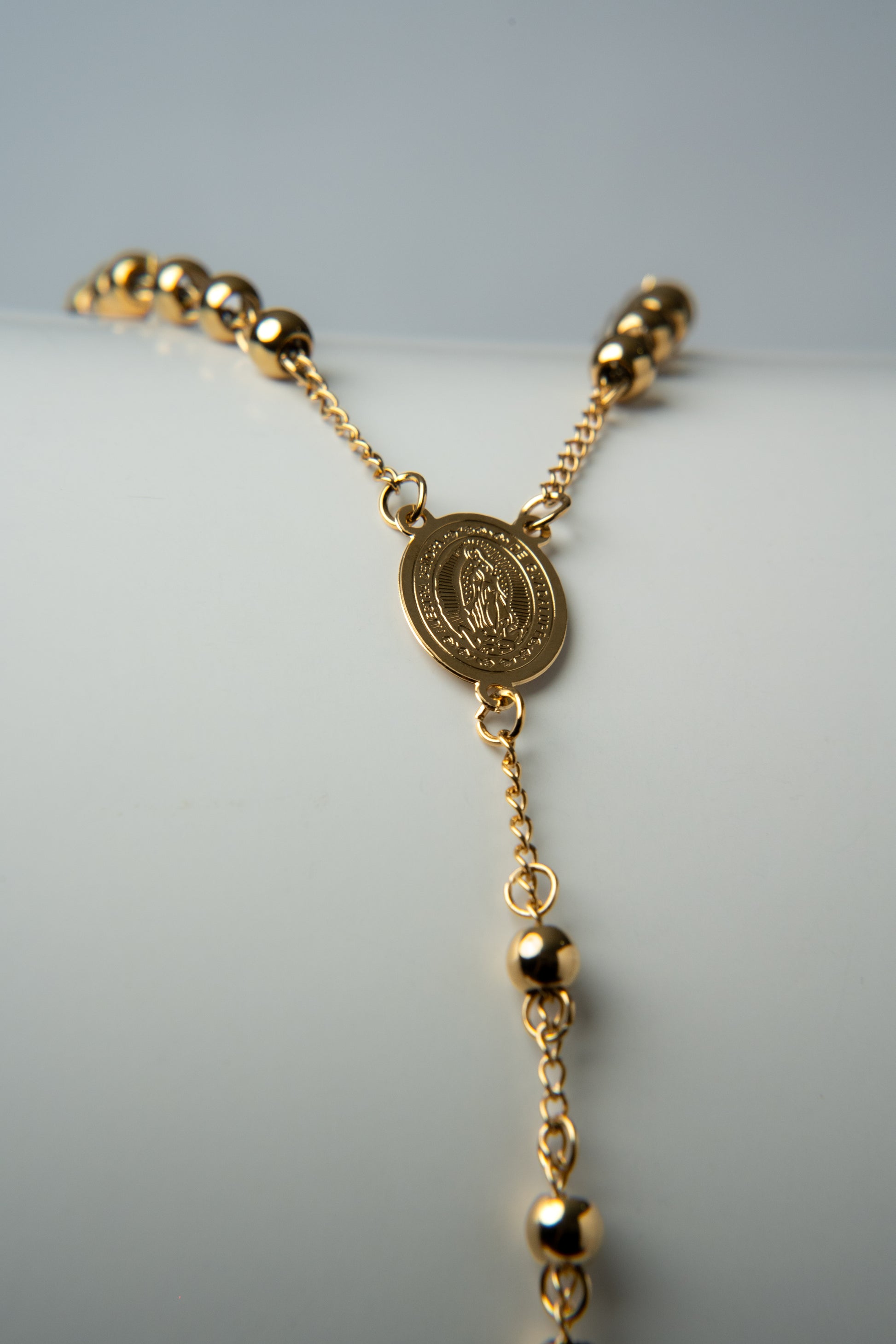 Elegancia y Fe en Oro; Descubre esta hermosa camándula de oro para caballero, diseñada para combinar elegancia y significado espiritual. Con un delicado diseño de cadena de bolitas doradas y un medallón ovalado que conecta a un crucifijo dorado, esta camándula es perfecta para aquellos que buscan un accesorio sofisticado y con un toque de fe.