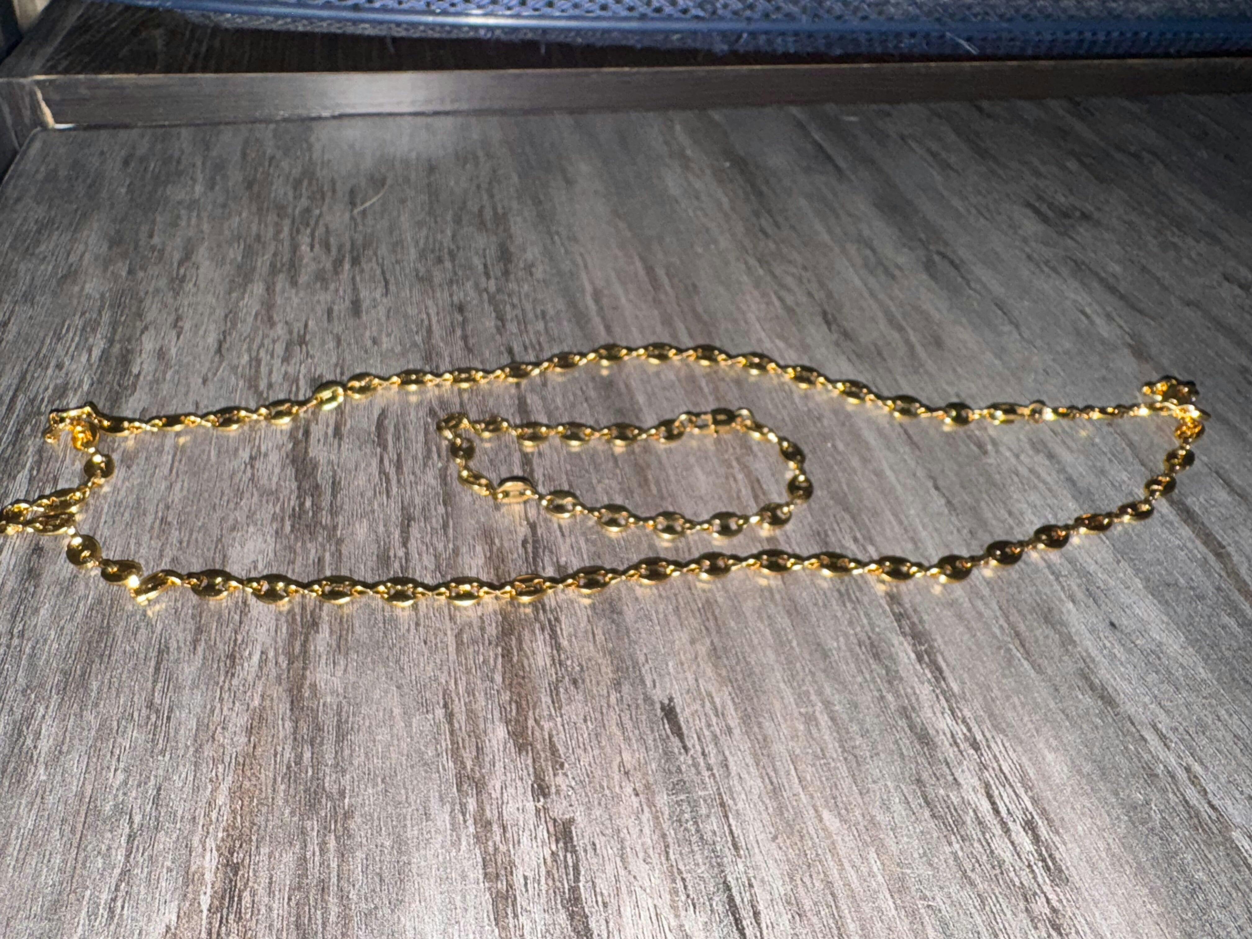 ¡Dale un toque de elegancia a tu look! Este conjunto combina una cadena y pulsera de oro con diseño minimalista y estilo urbano, ideal para caballeros que buscan un look chic y moderno. Con eslabones elegantes y material de oro para un brillo duradero, es perfecto para cualquier ocasión.