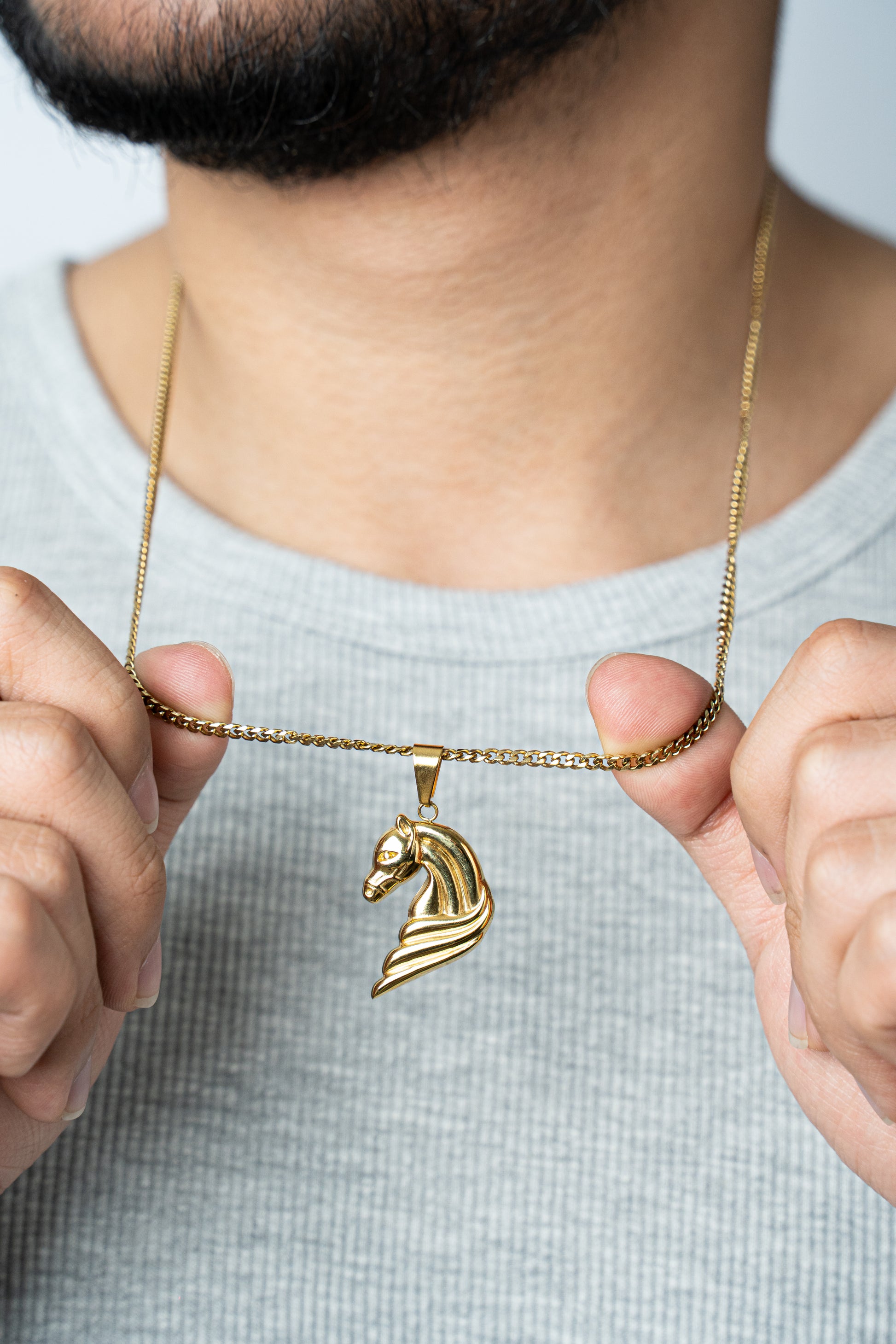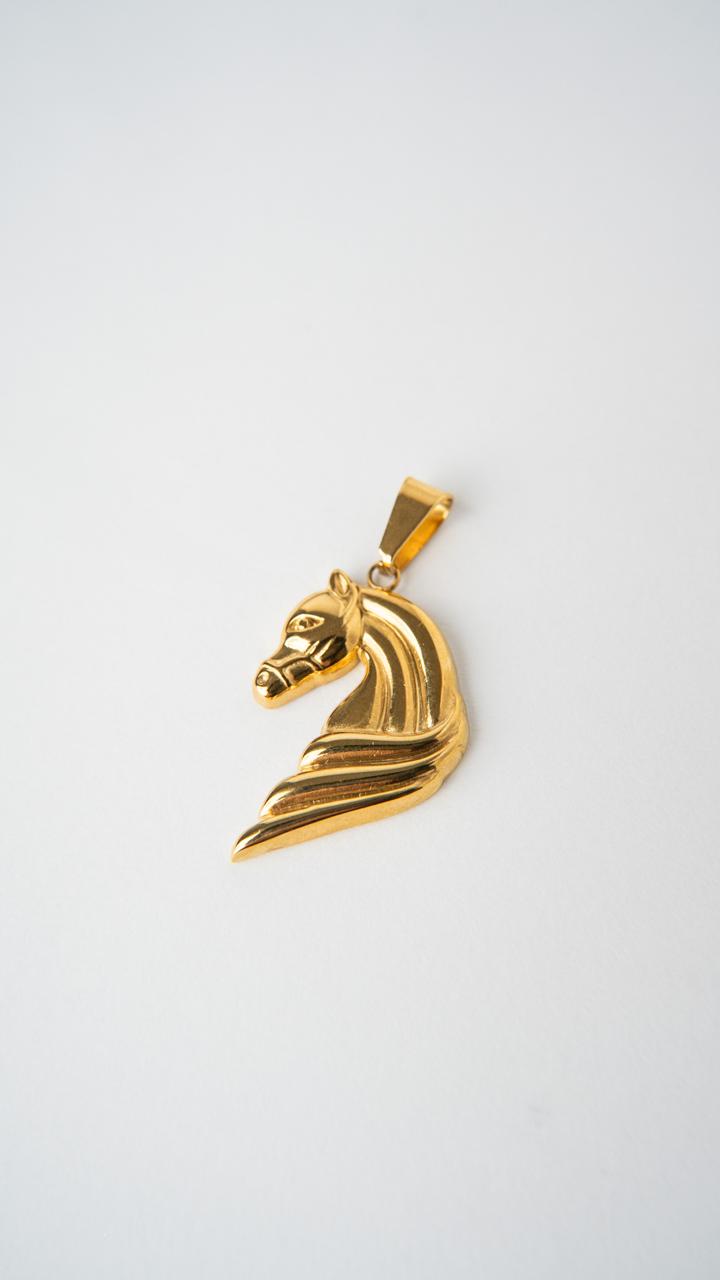 Un elegante dije en forma de caballo elaborado en oro, con detalles finos y un diseño minimalista pero impactante. Ideal para amantes de los caballos o para aquellos que buscan un accesorio con un toque clásico y sofisticado. Su diseño en oro resalta su belleza y lo hace perfecto para llevar como un collar. Un detalle único para expresar estilo y personalidad.