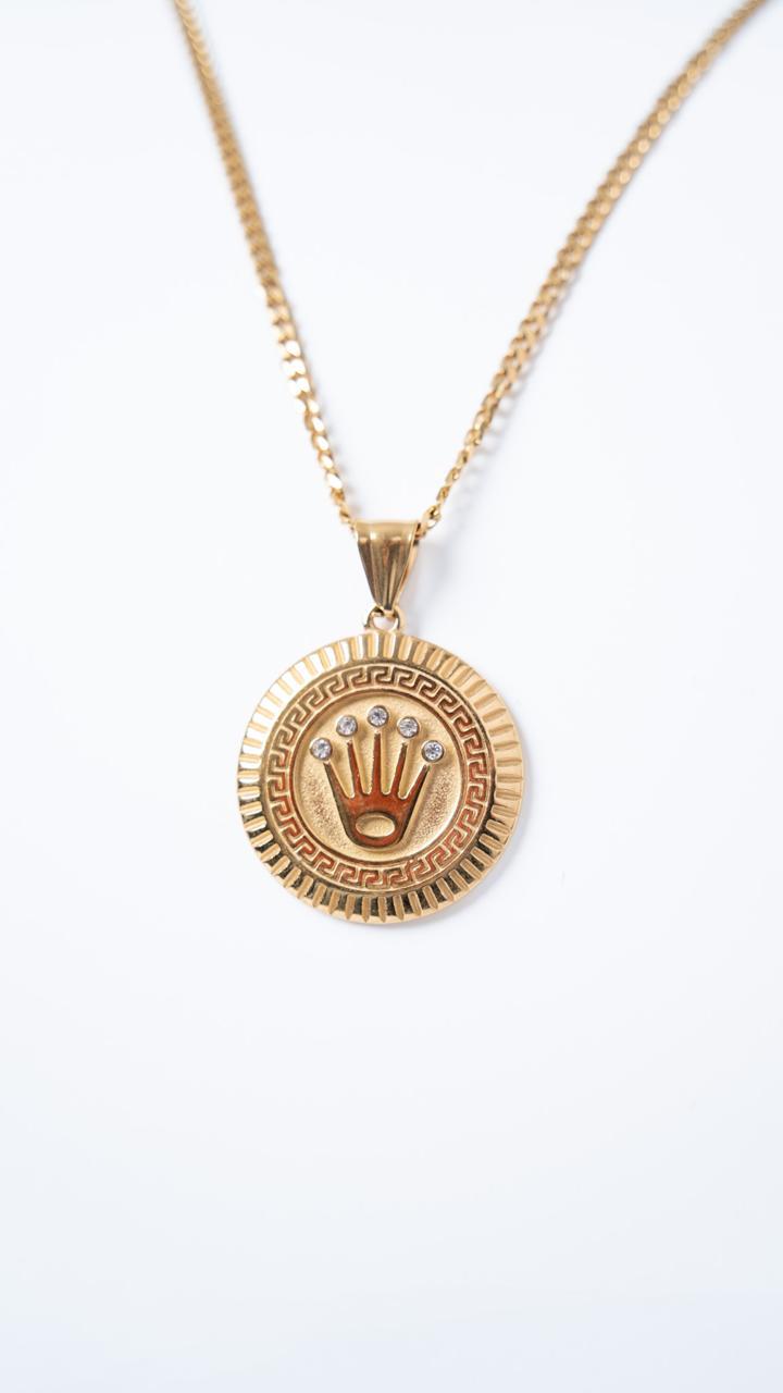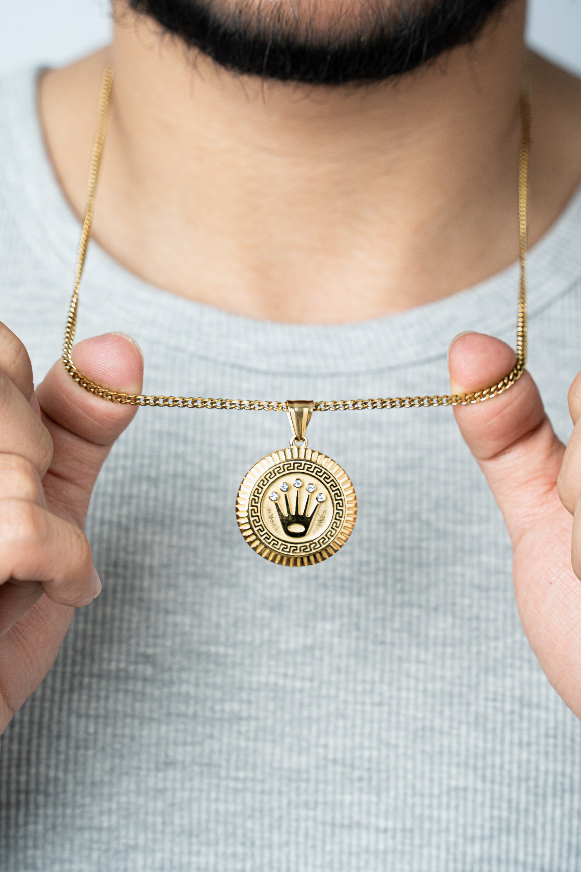 Descubre este elegante dije de oro con un diseño que combina sofisticación y estilo. El medallón cuenta con una corona central adornada con pequeños diamantes, rodeada por un patrón greco-romano que añade un toque clásico y lujoso. Perfecto para aquellos que buscan un accesorio distintivo y con personalidad.