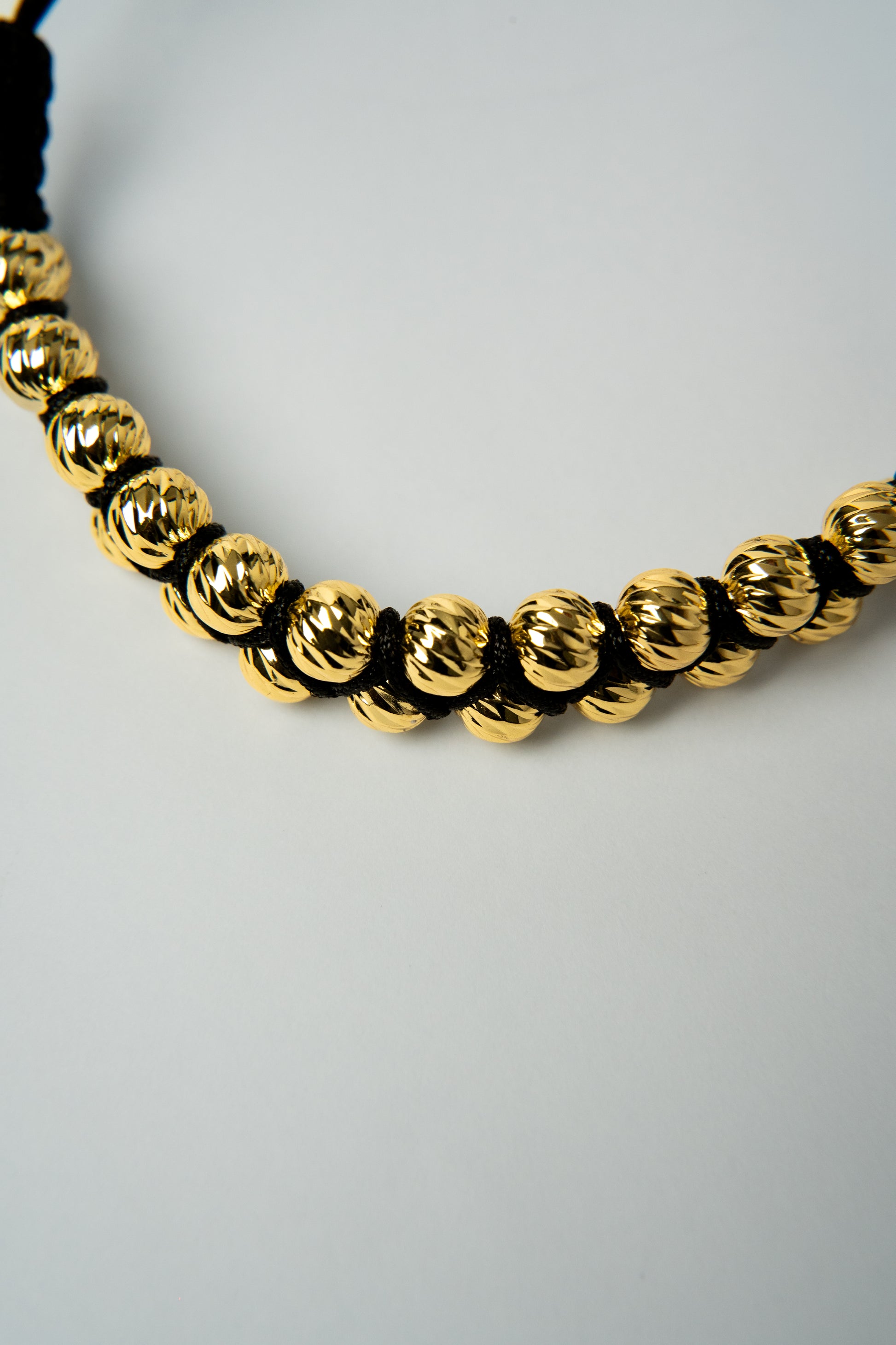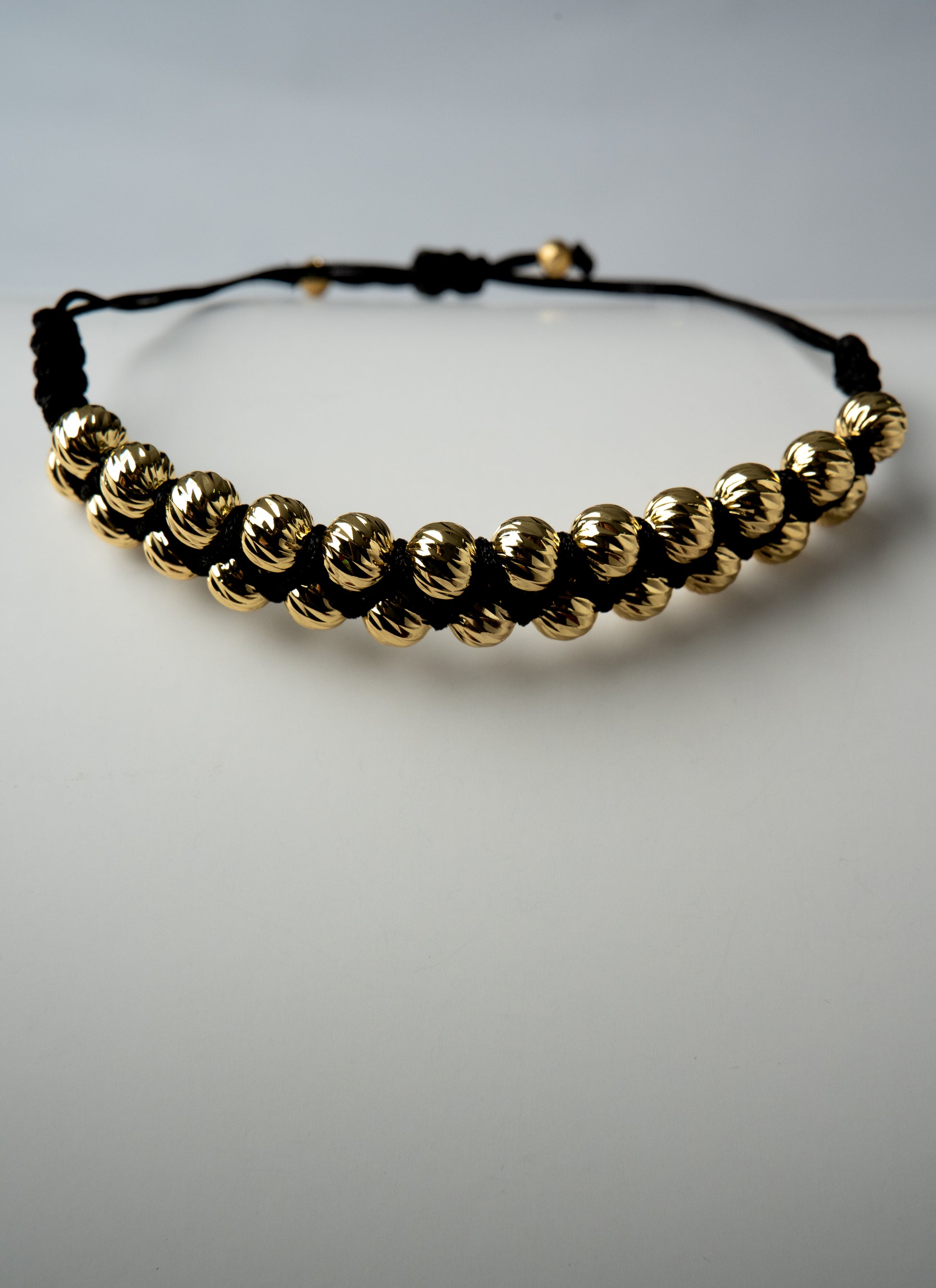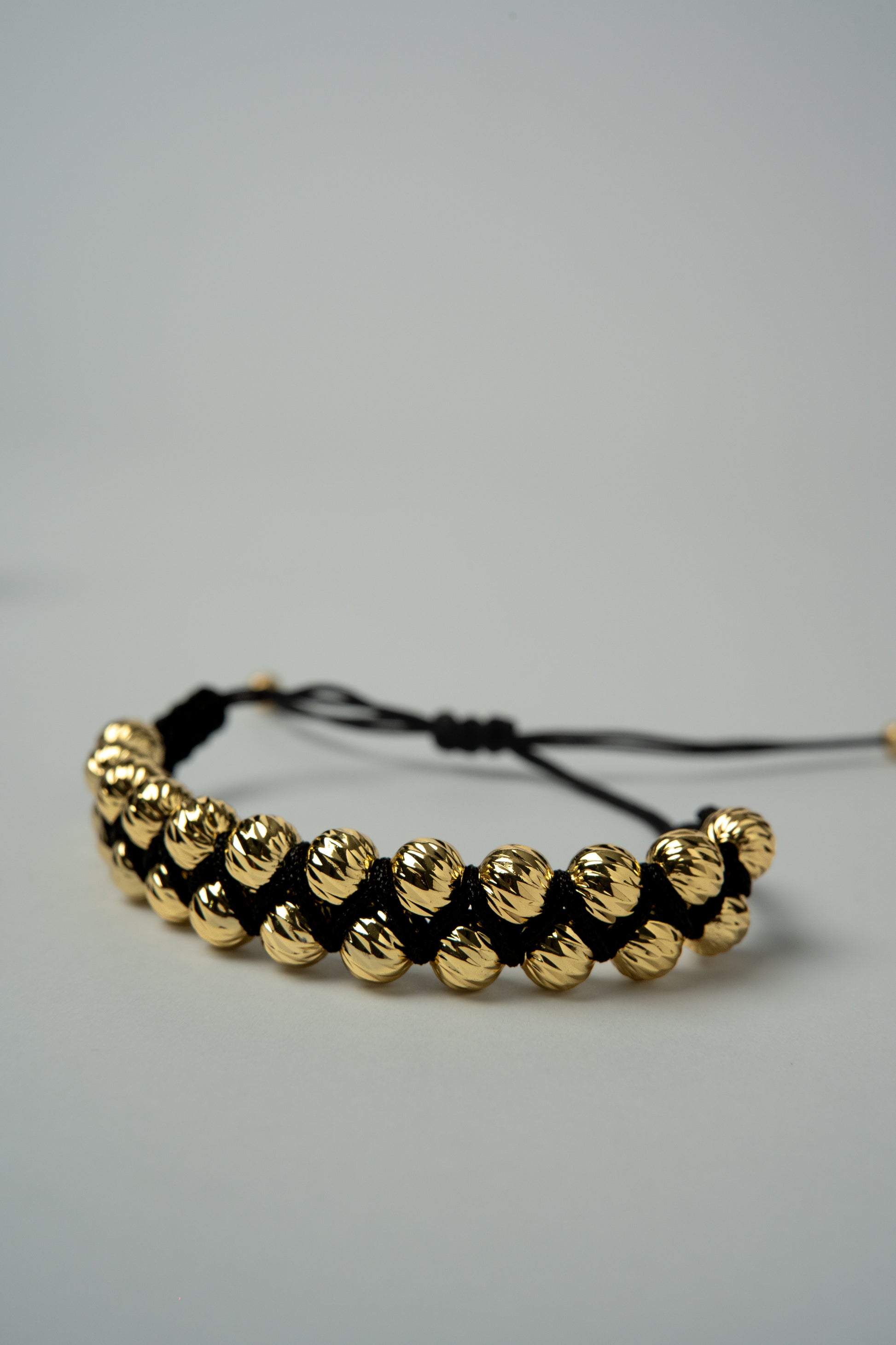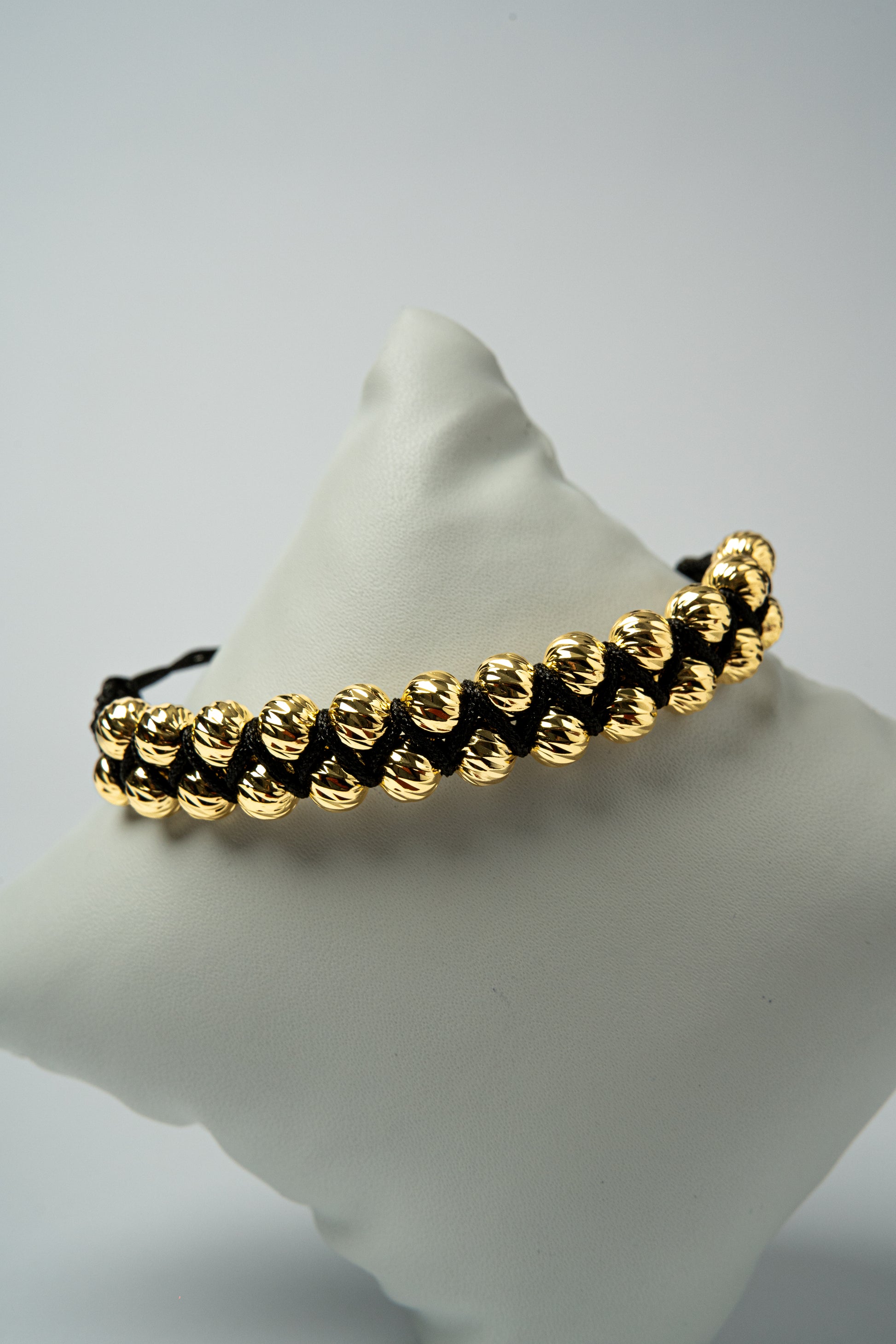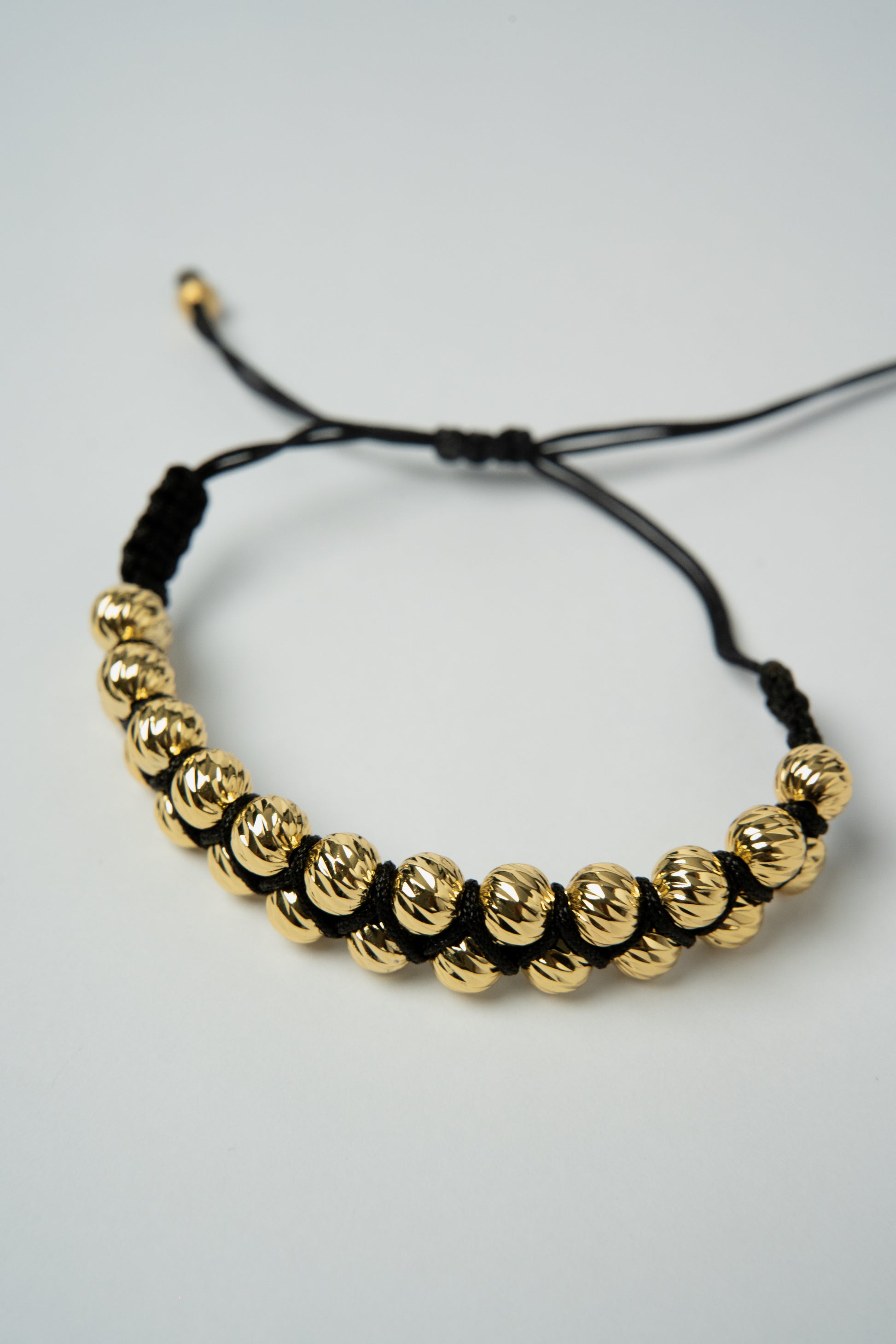 Esta elegante pulsera está compuesta por 24 balines de oro intercalados con cordón negro, creando un diseño minimalista pero impactante. Los balines de oro aportan un toque de sofisticación y estilo a cualquier outfit. La pulsera se ajusta cómodamente gracias a su diseño con cordón negro, permitiendo un look moderno y versátil.