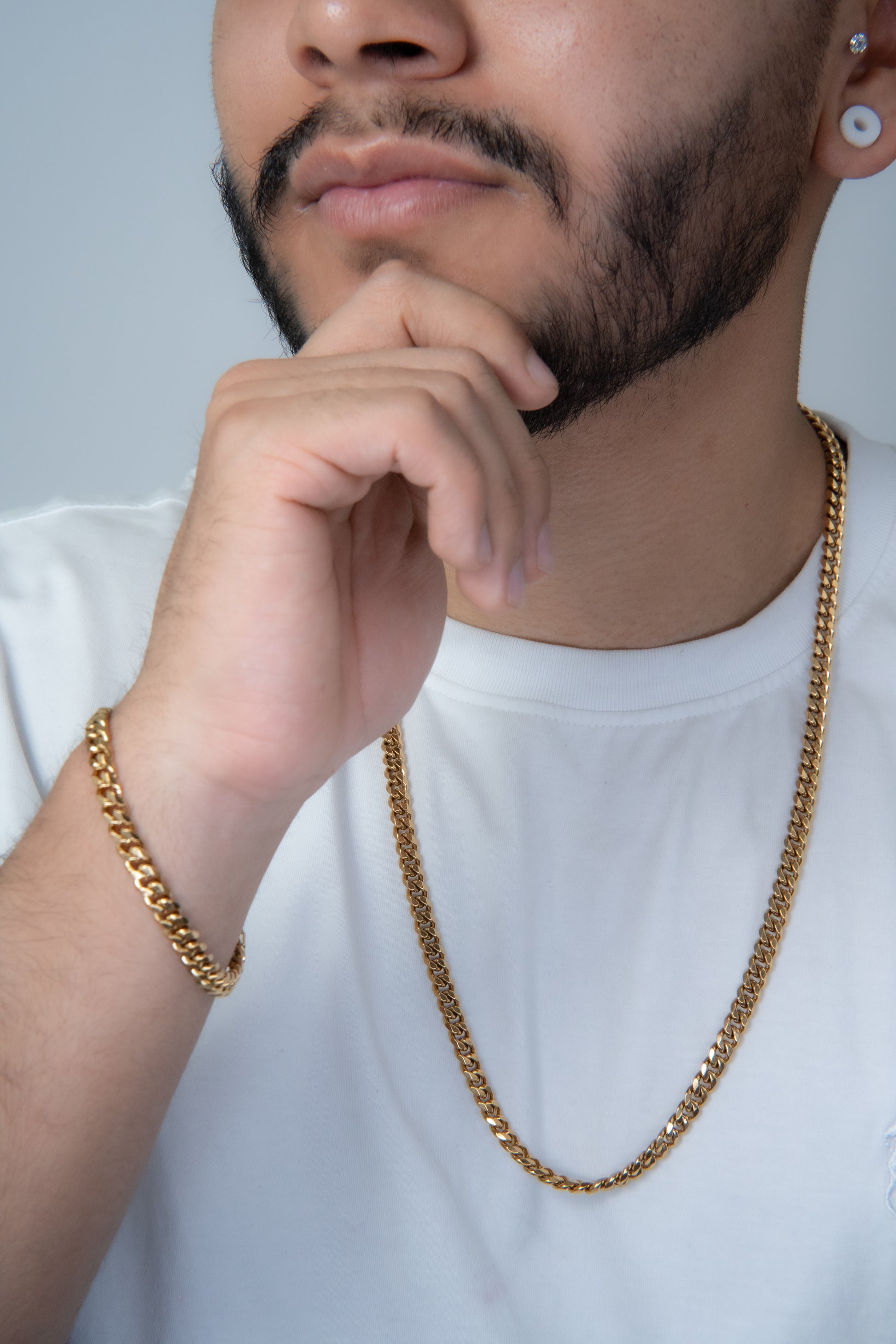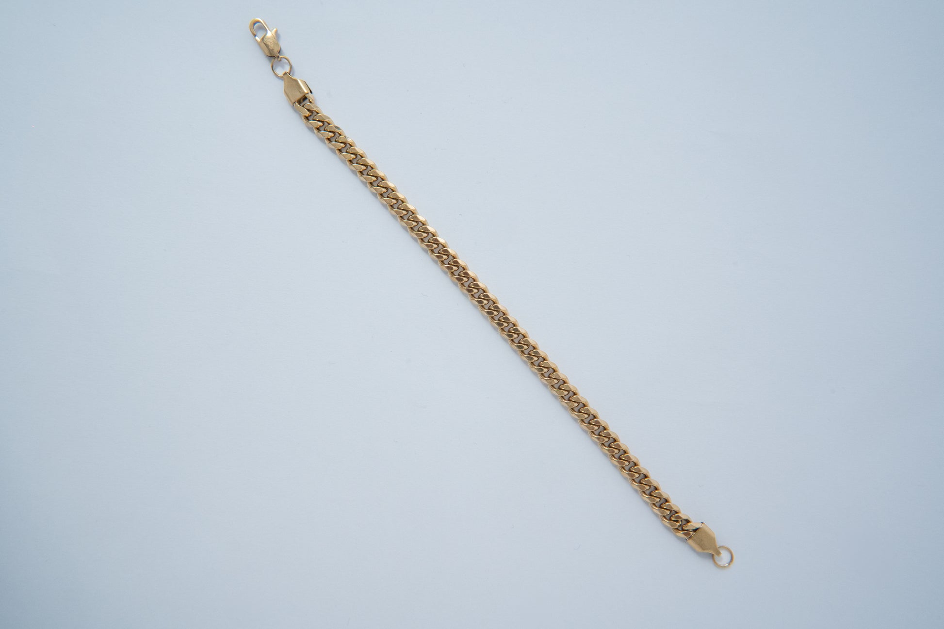 Esta pulsera Cubana para caballero es una pieza de joyería elegante y sofisticada, perfecta para aquellos que buscan un accesorio con estilo y personalidad. Hecha con eslabones gruesos de oro que se entrelazan en un diseño clásico de cadena cubana, esta pulsera es ideal para complementar looks casuales o formales.