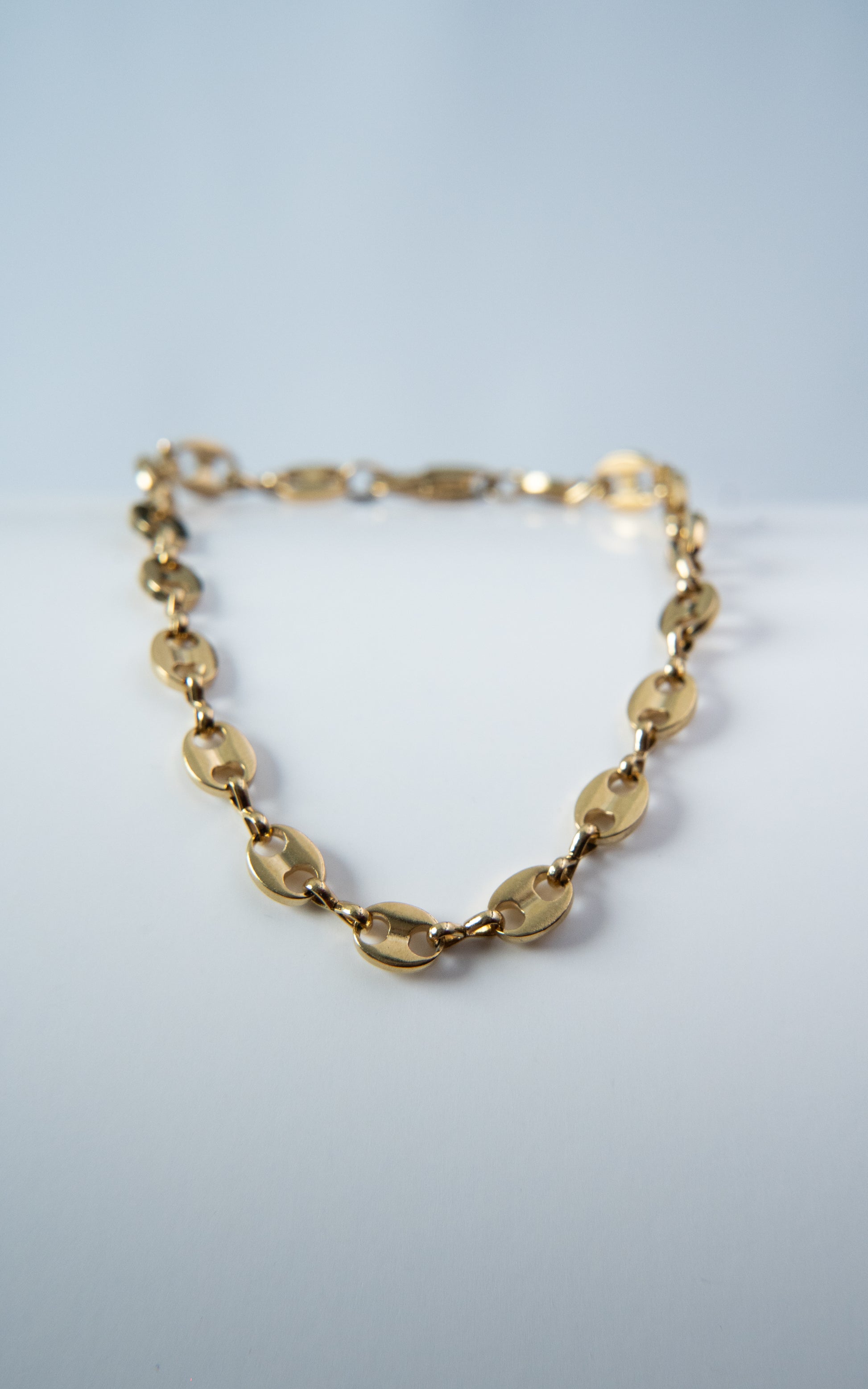 Esta pulsera de estilo minimalista está diseñada para hombres que buscan un accesorio elegante y sofisticado. Fabricada con eslabones de oro que brillan con un acabado brillante, esta pulsera es perfecta para complementar looks casuales o formales. Su diseño simple pero impactante la hace ideal para cualquier ocasión.